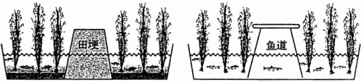 (2023·6 月浙江卷)某城市公园引入稻鱼生态系统,将原来分割稻田的田埂用架空的木栈道修建成鱼道,取得了良好效益。下图为改造前后田埂和鱼道的示意图。完成 1~2 题。
