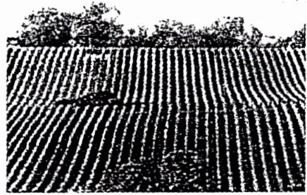 葡萄喜光、耐旱。右图为某坡度较大的地方采用顺坡垄方式种植葡萄的景观。该地位于52°N附近,气候湿润。