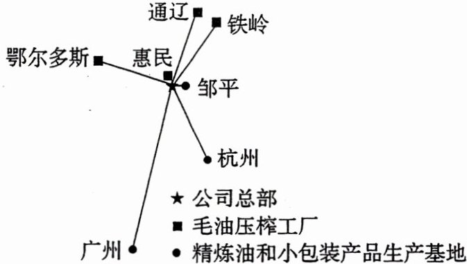 山东邹平某公司是我国建设最早、目前规模最大的玉米油产品研发和生产企业,其玉米油销售量占国内市场的50%。该公司在山东惠民、辽宁铁岭、内蒙古通辽和鄂尔多斯建有毛油压榨工厂,在公司本部、浙江杭州、广东广州建有精炼油和小包装产品生产基地(下图),将毛油运输至精炼油生产基地多使用集装箱液袋(一次性使用的储存和运输各种非危险液体货物的软体包装容器),使用罐箱或铁桶运输则越来越少。