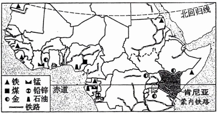 (2023·海南卷)由中国承建运营的蒙内(蒙巴萨至内罗毕)铁路是肯尼亚在近 100 年间建设的第一条铁路。在铁路建设过程中,为当地创造了约 4.6 万个工作岗位,对肯尼亚国内生产总值的贡献超过 1.5%。下图为非洲部分区域图。据此完成 1~2 题。