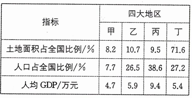 (1)甲、乙、丙、丁中代表中部地区的是 ( )