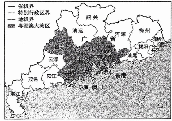 (2021·江苏卷)近年我国印发了《粤港澳大湾区发展规划纲要》,将珠三角城市群(广东省9个城市)升级为粤港澳大湾区(9+2)。下图为“粤港澳大湾区范围图”。据此完成1~3题。