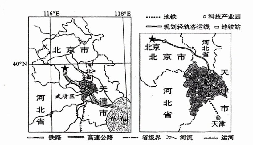 (2)图中所示区域内规划修建一条轻轨客运铁路,说明这一举措对促进京津冀交通一体化的意义。(6分)