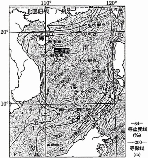 [典例](江苏卷)2012 年 6 月,国务院批准设立三沙市,管辖西沙、中沙、南沙群岛的 260 多个岛礁及 200 多万平方千米的海域。下图是南海海域 8 月份表层海水盐度分布图。读图,完成问题。