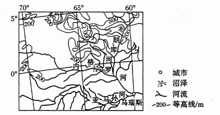 一位被热带雨林风光吸引的游客从马瑙斯出发,乘船沿内格罗河(下图)溯源而上,见两岸植被繁茂,河上很少有桥。