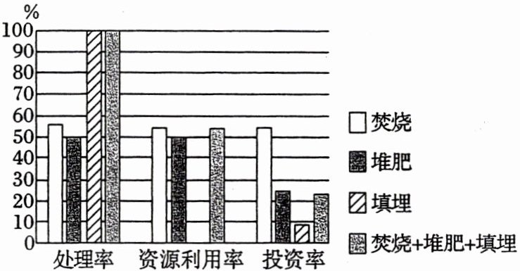$5.$阅读图文材料$,$回答下列问题。$(16$分$)$目前$,$处理城市生活垃圾的主要方法有焚烧、堆肥、填埋及多元化处理。下图为北京城市生活垃圾不同处理模式下处理率、资源利用率和投资率统计图