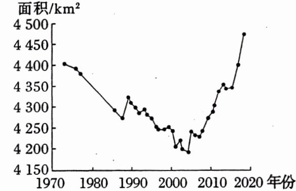 $(2024·$浙江嘉兴测试$)$青海湖位于我国青藏高原东北部、青海省境内$, $是我国最大的内陆湖。下图为$ 1973~2018 $年青海湖面积变化图。完成$ 3~4 $题。