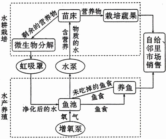 “养耕共生”模式是利用养耕共生系统技术建立起来的一种新型都市农业生产形式,适用于城市屋顶、阳台、地面庭院等地方,产品自给或在邻里市场销售。以色列国土大部分是荒漠,水资源奇缺,城市人口比重大。近些年来,以色列在城市推广“养耕共生”模式,促进了绿色科技型都市农业的发展。下图示意养耕共生系统运作原理。