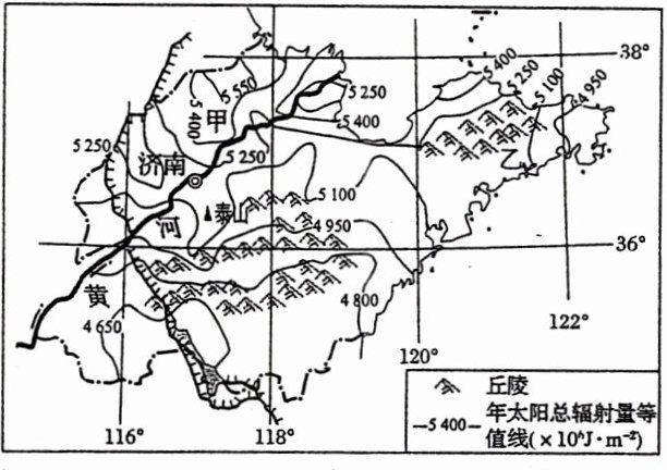 (2024·浙江宁波高三期末)下图为“山东省年太阳辐射总量分布图”。据此完成4~5题。