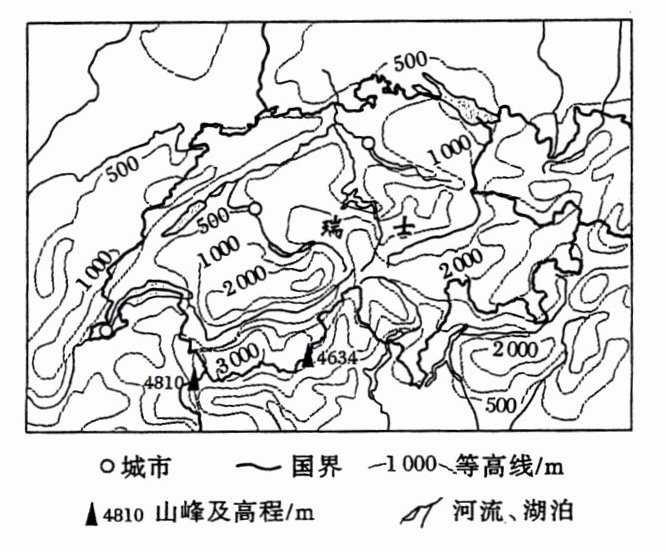 瑞士矿产资源贫乏,经济发达。年降水量1 000毫米以上,河湖众多,工业、金融业、旅游业为经济的三大支柱,工业以低原料消耗的机械制造、精细化工、医药、钟表等为主,技术先进。有完整的金融法律和监管体系,提供广泛、专业、高度国际化的金融服务。在能源消费构成中,水电占 30%以上。上图示意瑞士的地形。