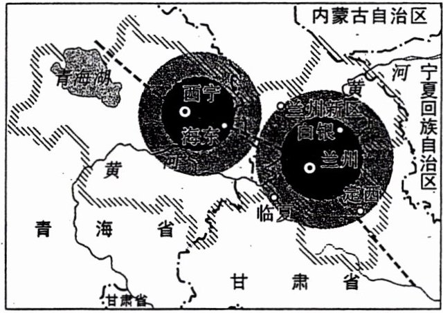 兰西城市群是指以甘肃省省会兰州市、青海省省会西宁市为中心,主要包括甘肃省定西市和青海省海东市、海北藏族自治州等22个地州市的经济地带,是中国西部重要的跨省区城市群。2022年2月17日,两省政府办公厅联合印发《兰州—西宁城市群发展“十四五”实施方案》。下图示意兰西城市群空间格局。据此完成1~3题。