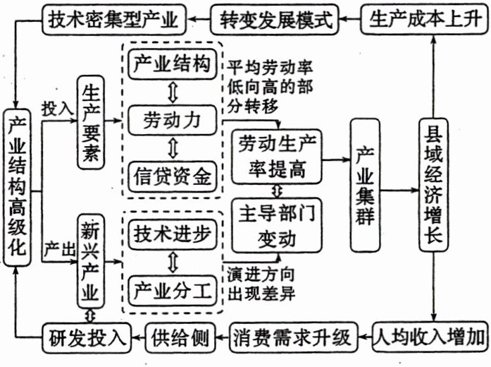 (2024·陕西西安模拟)产业结构高级化往往具体反映在各产业部门之间产值、就业人员、国民收入比例变动的过程上,标志着区域经济发展水平的高低和发展阶段、方向。下图是区域产业结构高级化与县域经济增长互动机制示意图。据此完成1~3题。