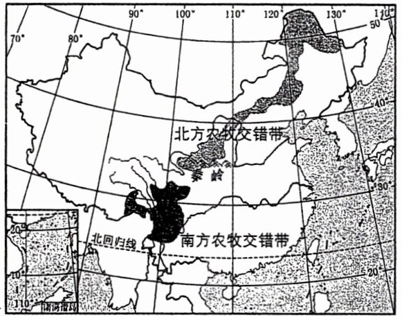 (2024·北京丰台区期末)农牧交错带指我国东部农耕区与西部草原牧区相连接的半干旱生态过渡带。下图为“我国农牧交错带分布图”。据此完成1~3题。