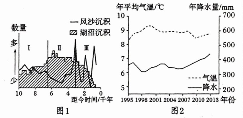 毛乌素沙地中流动沙地、固定沙地与湖泊、河流、沼泽等景观并存。上述景观在自然和人文因素影响下可发生转化。1995~2013年,流动沙地趋于固定,湖沼面积减小。一般而言,风沙沉积越多,风沙活动越强。某科研团队调查1万年以来毛乌素沙地东南部湖沼沉积和风沙沉积数量的变化,结果如图1所示。图2示意毛乌素沙地1995~2013年气温、降水的变化。