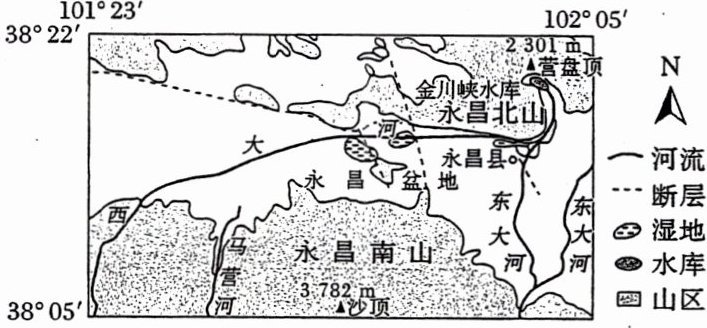 河西走廊西大河流域的永昌盆地介于永昌南山与永昌北山之间(下图),海拔1 875~2 106 m,地势自西南向东北倾斜。盆地内分布有若干块湿地,这些湿地的形成是地形、地质条件及地表水、地下水共同作用的结果。金川峡水库位于盆地最低处,是当地生产和生活的重要水源地。