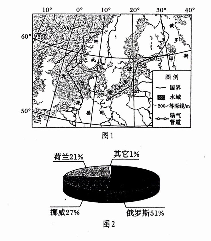 材料 西欧是世界上重要的天然气输入地区。图1为欧洲部分地区略图。德国是天然气进口大国,92%的天然气需要从国外进口。图2为2017年德国天然气进口来源构成图。目前,俄罗斯、德国等国家在图1中甲乙两地间新建天然气输气管道。