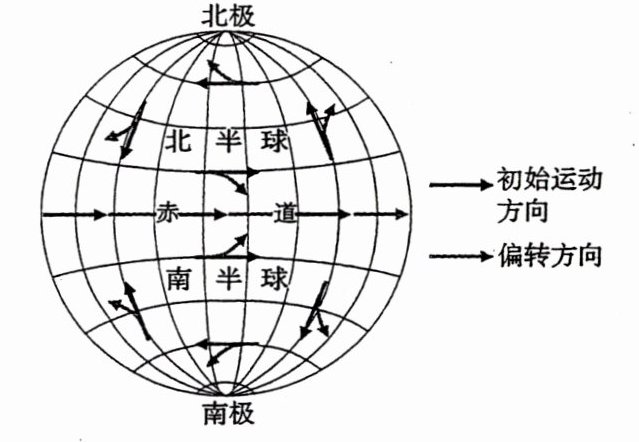 地球自转→地转偏向力→地表物体水平运动方向发生一定的偏转