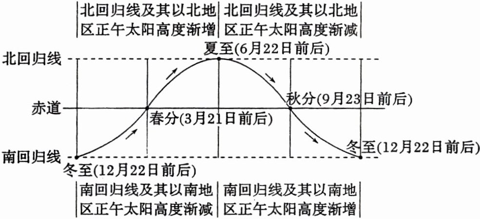 太阳直射点向本地所在纬线移来,则正午太阳高度增大,移去则减小。如图所示: