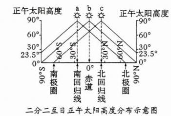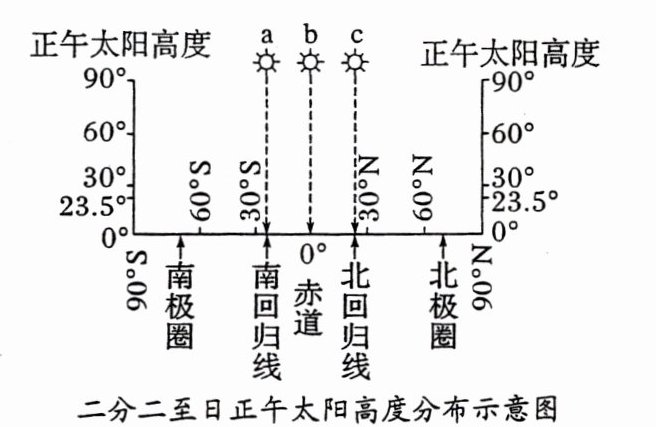 (2)太阳直射点 ①北回归线 南半球 c ②南回归线 北半球 a ③赤道 b