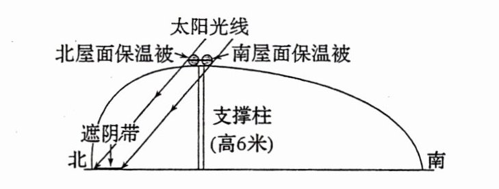 (2022·福建卷)非对称结构保温大棚的保温被通常白天收卷至顶部,以便棚内作物进行光合作用,收卷的保温被在棚内地面形成遮阴带(下图)。陕西省某地理研学小组观测当地大棚正午地面遮阴带的年内变化(忽略收卷的保温被厚度影响),发现棚内地面遮阴带在2月26日出现,3月29日面积最大,一段时间后变小。据此完成1~2题。