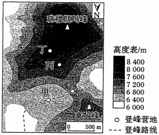 [典例](2020·山东卷)2020年5月27日上午11时整,中国珠峰高程测量登山队将五星红旗插上世界最高峰峰顶,实现了四十五年后我国测绘队员的再次登顶。从位于5200米的大本营向上,队员们要经过甲、乙、丙、丁四个营地(下图),其中一个营地由于空气流通不畅,容易引起高原反应,被称为“魔鬼营地”。据此完成下题。