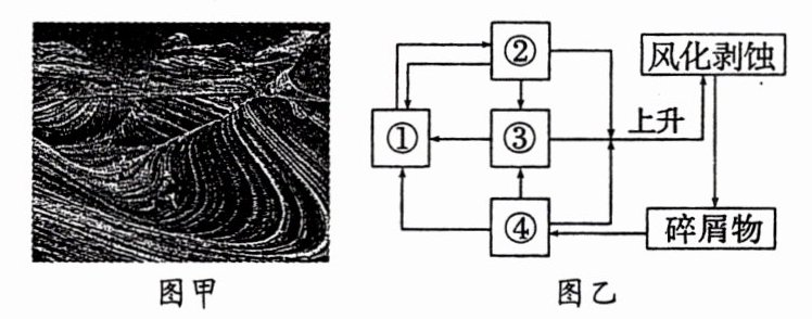 5. 图乙为地壳物质循环示意图,上述波浪岩与图中数字表示的岩石类型一致的是( )