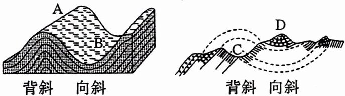 | |形成_______,如C处|背斜顶部因受张力产生_______,容易被侵蚀成谷地|