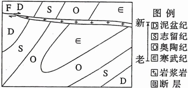 1. A [根据图示信息可知,岩浆岩位于断层F中,说明岩浆沿断层F侵入,形成岩浆岩,①正确;根据图示信息可知,图中岩层两翼新中间老,为背斜,岩浆岩切穿背斜轴部,②正确,③错误;岩浆岩将寒武纪岩层切断,说明岩浆岩形成晚于寒武纪,④错误。所以选A。] 2. C [该地先是经过固结成岩作用形成各种岩石,然后水平岩层受到挤压,弯曲变形,在进一步受到挤压作用的情况下,岩层断裂形成断层,发生岩浆活动,所以该地区经历的地质过程是固结成岩—褶皱隆升—断层错位,C正确,A、B、D错误。所以选C。]