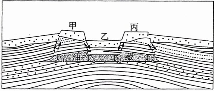 [典例] (2021·河北卷)下图为我国某盆地油藏地质剖面示意图,其中F₁~F₄为断层。在多次区域性水平挤压力作用下,大型背斜油藏受到构造甲、乙、丙的破坏,使石油组分大量散失。据此完成(1)~(2)题。