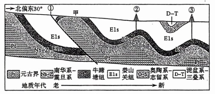3. C [①地质构造为断层构造,是岩层受到的压力或张力作用超过了岩石所能承受的范围,岩石发生断裂并沿断裂面发生明显位移形成的。根据图中方向信息,其东北侧岩层发生明显弯曲变形,是受东北—西南方向挤压形成的,C正确,A、B错误;岩层层理结构明显,属于沉积岩,不是岩浆活动形成的,D错误。故选C。] 4. D [根据图中信息可知,②钻井附近岩层向上拱起,为背斜构造。根据材料,甲处是该区域背斜主体构造的核心部位,因此②钻井附近是在背斜东北翼次级背斜近核部,D正确。] 5. B [图示为某寒武系牛蹄塘组页岩气,与其他组岩层无关,A、D错;钻井附近牛蹄塘组岩层顶部在甲附近有张裂发育,②③与甲处于同一个背斜构造区域中,产生的页岩气无法大量储存,导致②③钻井附近页岩气储量贫乏,B正确;牛蹄塘组页岩气形成于寒武系,形成时间长,C错。故选B。]