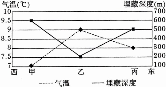 某地质考察队对重庆某地进行考察,测得其东西向且相邻不远的甲、乙、丙三地的气温和同一岩层的埋藏深度。据此完成1~2题。
