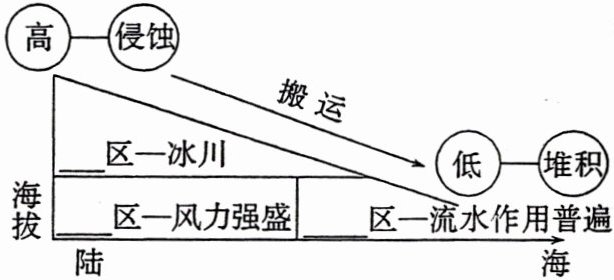 太阳辐射能@@大气、生物@@崩解@@冰川@@地表岩石@@风化产物@@侵蚀@@流水@@风化或侵蚀@@堆积地貌