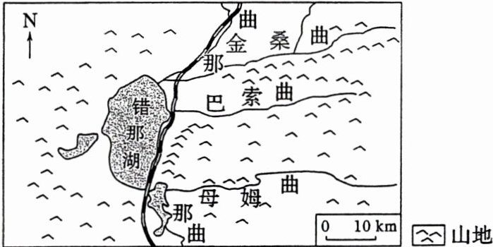 (1)多条河流在此注入错那湖,泥沙沉积,河口三角洲面积较大。冬春季河流水位低,河滩泥沙裸露;错那湖水位低,(因河口外湖区水深较浅)出露的湖滩泥沙面积较大。