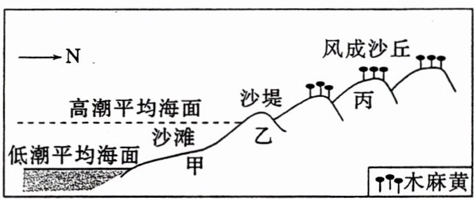 (2024·河北石家庄模拟)下图示意某海岸地貌纵剖面,主要有沙滩、沙堤、风成沙丘,其中风成沙丘种植大量木麻黄。受特大高潮、高潮、低潮时海水沉积作用和风力作用的影响,甲、乙、丙三处沙粒大小不同。据此完成3~4题。