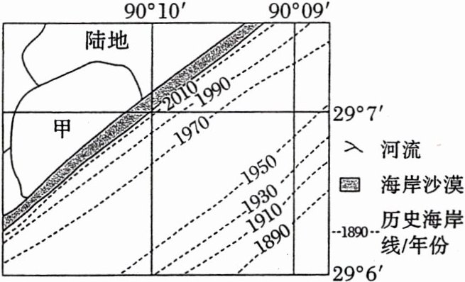 [典例](2022·全国甲卷)如图示意北美东南部沿海冲积平原某区域 1890 年以来海岸线的变化。读图,完成(1)~(2)题。