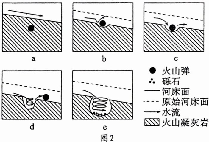 在雷州半岛龙门河流域的河床上,分布着一种火山凝灰岩河流壶穴(图 1)。火山凝灰岩是由火山灰及火山碎屑物质等形成的岩石,往往夹杂着火山弹。由于火山弹和周围岩石的性质差异,在流水作用下,河床上形成深浅不一的壶穴。图 2 示意该地河流壶穴形成过程。