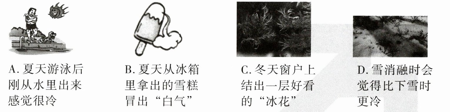 2. 夏天,当我们从冰箱里拿出来一瓶饮料后,放置一会儿就会发现饮料瓶上面有很多“汗珠”,下列生活现象中与饮料瓶“流汗”发生的物态变化相同的是 ( )