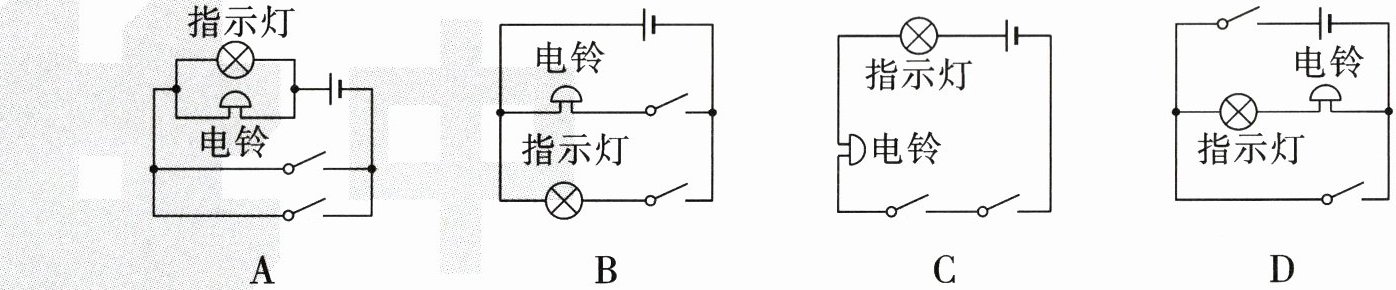 7. (教材P88第5题改编)公交车后门的两个扶杆上各装有一个按钮,当乘客按下任何一个按钮时,电铃都会响起,并且指示灯发光,提醒司机有乘客要下车. 下列电路图符合上述要求的是 ( )
