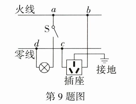9. 如图是家庭电路的一部分,小明把加湿器接入三孔插座,一段时间后,加湿器突然停止工作,但客厅的照明灯仍正常发光. 下列相关说法正确的是 ( )