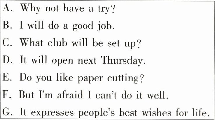 Joe正在向Amy讲述学校新开设的剪纸俱乐部,请从方框内的选项中选出能填入空白处的最佳选项,一起来了解他们的课余生活吧!