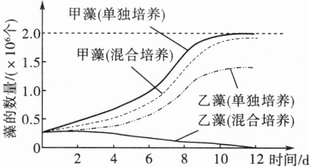 B. 混合培养时种间竞争是导致甲藻种群数量在10~12 d增长缓慢的主要原因