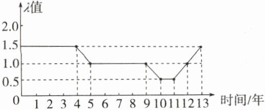下图表示生物科技工作者对某种群的λ值(λ表示当年种群数量是前一年种群数量的倍数)进行了连续13年的研究后绘制的变化曲线。回答下列问题: