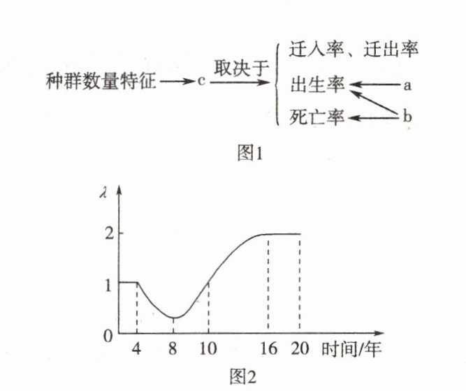 4. 图1为种群数量特征的概念图。在调查某林场松鼠的种群数量时,计算当年种群数量与前一年种群数量的比值(λ),并得到如图2所示的曲线。回答下列问题: