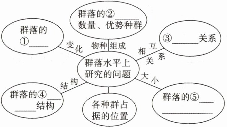 群落的①______ 群落的②数量、优势种群 物种组成 ③______关系 群落的④______结构 各种群占据的位置 群落的⑤______