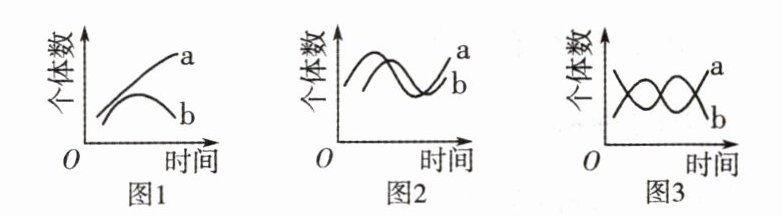 提示:(1)先增加或先减少的是被捕食者,如图2中的a;后增加或后减少的是捕食者,如图2中的b。@@(2)图1中的两种生物的竞争力明显有悬殊,竞争的结果往往会使处于不利地位的生物灭绝;图3中的两种生物的竞争力相当,不会导致其中一种生物灭绝。@@(3)没有。若有,有可能呈现图①所示曲线,两种生物生态位完全相同,对资源争夺激烈,竞争力强的占优势,另一种则灭绝。