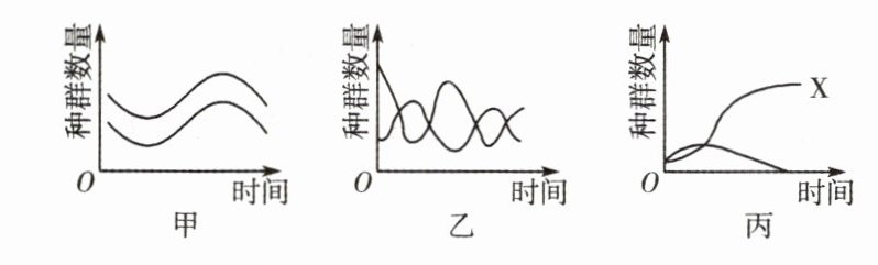 @@2. B 解析:由题图中生物的种群数量变化情况可以判断,甲为互利共生关系,可用来表示豆科植物与根瘤菌的数量变化;乙为捕食关系,而噬菌体与细菌之间是寄生关系,所以两者的种群数量变化关系不能用图乙表示;丙为种间竞争关系,X种群在竞争中处于优势且将另一种群淘汰,实验后期X种群密度增加,种内竞争加剧。