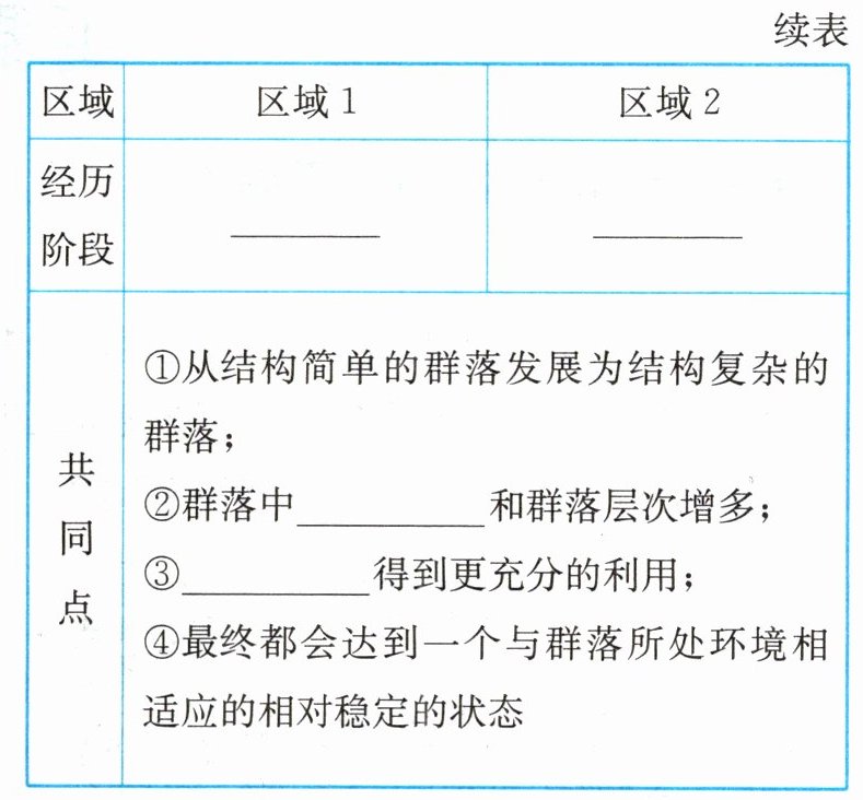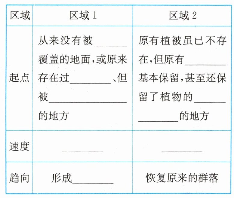 (2)总结出区域1与区域2进行的演替的不同,完成下表: