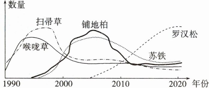 样方法@@随机取样@@种间竞争@@增长型@@在环境条件不受破坏的情况下,一定空间中所能维持的种群最大数量@@垂直结构@@光@@次生演替@@数学模型@@解析:(1)调查植物的种群密度一般采用样方法,该方法的取样关键是随机取样。罗汉松与苏铁都是植物,从数量变化曲线上看两者之间存在种间竞争关系。(2)从2010年到2020年,废弃农田中的罗汉松的数量是逐渐增加的,所以罗汉松种群的年龄结构应属于增长型;在2020年左右,其种群数量逐渐达到了环境容纳量,即K值。环境容纳量是指在环境条件不受破坏的情况下,一定空间中所能维持的种群最大数量。(3)到2020年,该废弃农田中的植物有高大的乔木、灌木、半灌木以及低矮的草本植物,它们高低不同,表现出了明显的分层现象,这说明生物群落存在明显的垂直结构,该结构的形成通常与植物对光的利用有关,分层现象能充分利用光照,提高能量的利用率。(4)该废弃农田的群落演替是从具有一定的土壤和植被条件开始的,所以该演替类型为次生演替。该林科院对这几种植物进行调查后绘制的数量统计图属于模型构建中的数学模型。