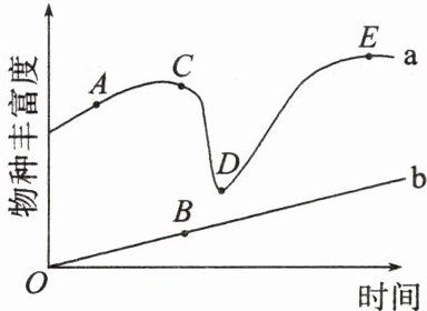 B 解析:a曲线的DE段和b曲线表示物种丰富度增加,生物种类增多,群落结构变得复杂,因此,在自然情况下,a曲线的DE段和b曲线的趋势,说明群落演替中营养结构往往从简单到复杂,A正确;a曲线的起点不是0,b曲线的起点是0,因此a代表群落的次生演替,b代表群落的初生演替,b群落演替过程比a艰难而漫长,B错误;a、b群落演替过程中,生物多样性发生变化,所以a和b过程一般需经历生物入侵→成功定居→竞争平衡,C正确;E点时物种丰富度保持相对稳定,说明E点可代表群落已达顶极群落阶段,此时所处阶段可能为灌木丛或其他类型,D正确。