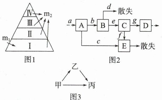 - (2)若图1中营养级Ⅰ、Ⅱ、Ⅲ各有一种生物甲、乙、丙,构成的食物关系如图3所示。其中甲能量中比例为x的部分直接提供给丙,要使丙能量增加A kJ,至少需要消耗甲的能量是__________ kJ。